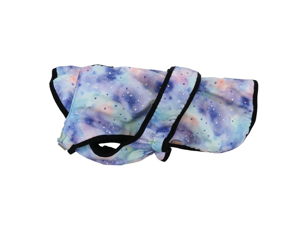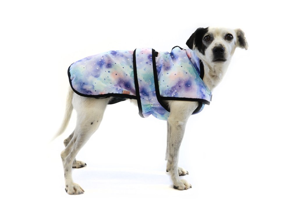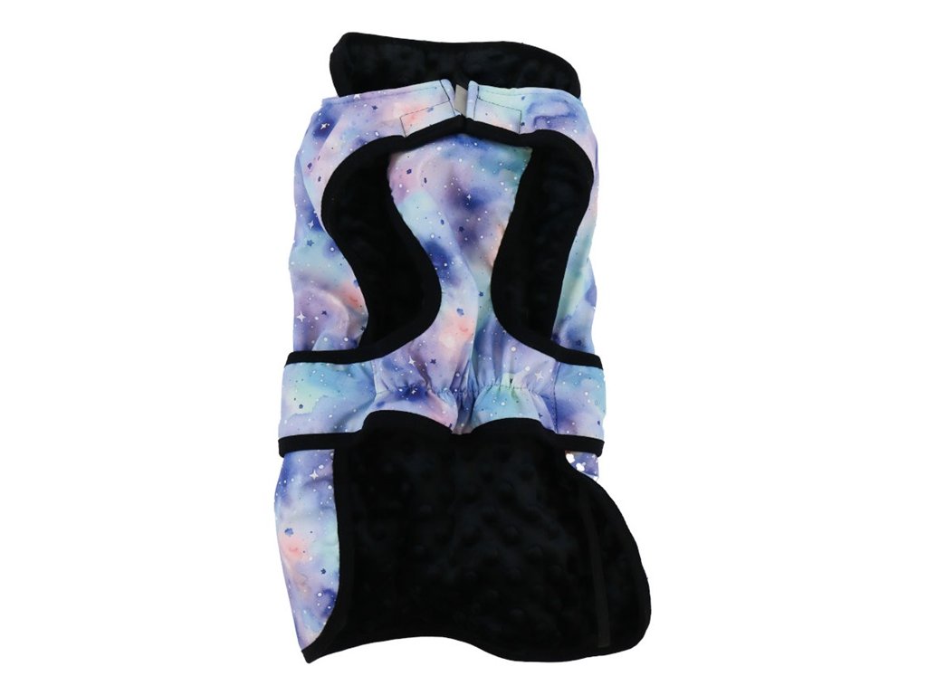 Zimní vesta Nebula XL LUX je určena psům s větším obvodem hrudníku. Svrchní vrstva z nepromokavého materiálu je zateplená vafixem a flanel fleecem (tzv. minky). Obleček je tvarovaný tak, aby psa neomezoval v pohybu, a přitom chránil všechny důležité partie jeho těla před chladem, větrem, deštěm i sněhem. Zateplený stojáček kryje šíji, gumičky na stehna zajišťují, aby obleček neodstával v zadní části, a elastický lem brání úniku tepla po celém obvodu. Za krkem je otvor pro připnutí vodítka k obojku a poutko pro zavěšení (při sušení atd.). Oblékání je snadné a rychlé: vesta se zapíná na suché zipy – 2 pod krkem a 1 na zádech (na hrudním pásu). Samozřejmostí jsou reflexní prvky.