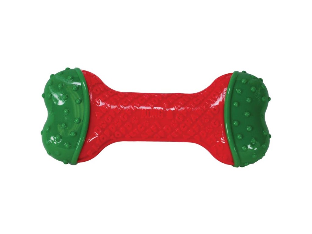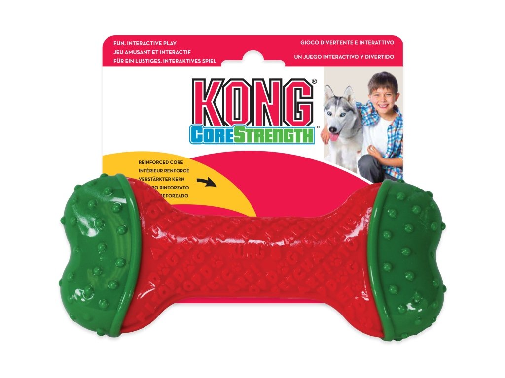 Gumová kost KONG Corestrength má vícevrstvé vyztužené jádro, díky němuž vydrží dlouho i psům se silnějším skusem. Vnější vrstva s reliéfní texturou nejen povzbuzuje žvýkací instinkt, ale při kousání také čistí chrup a masíruje dásně. Kost KONG Corestrength může eliminovat mnohá nežádoucí chování (např. kousání nábytku) způsobená strachem z odloučení, nervozitou z nového prostředí nebo nudou.