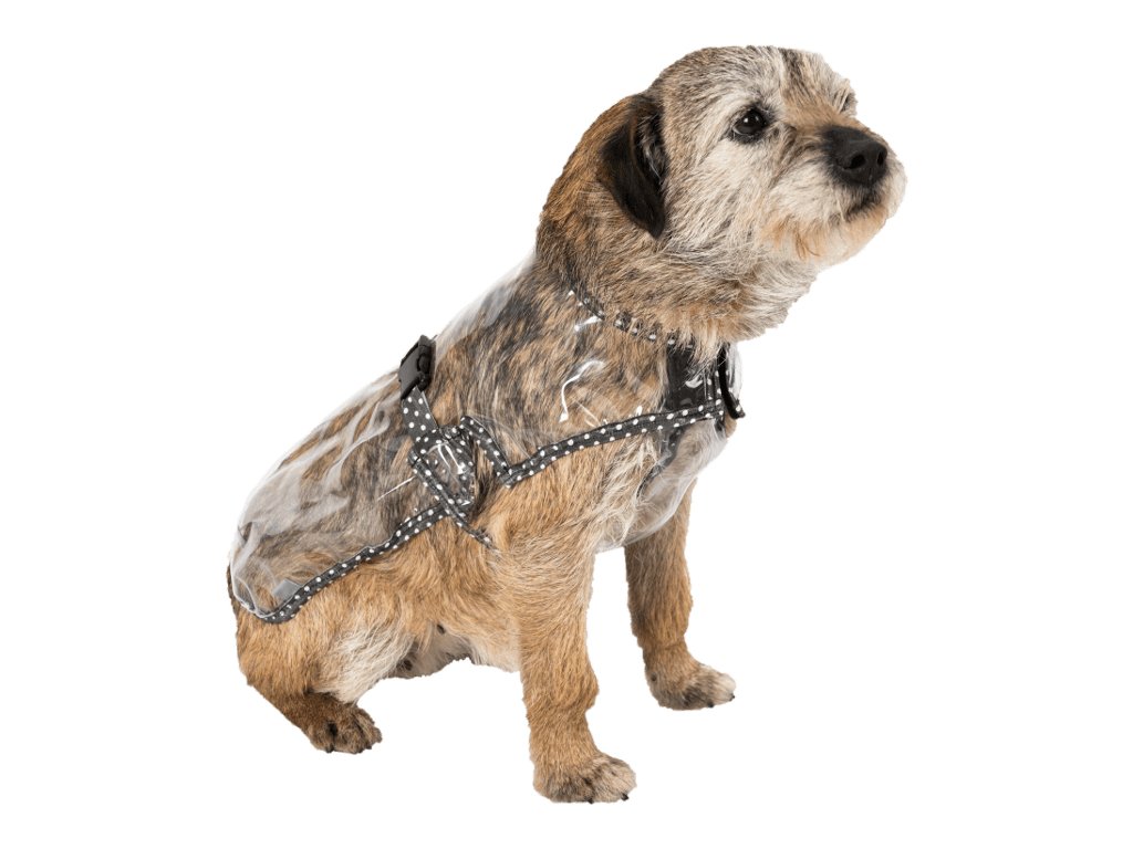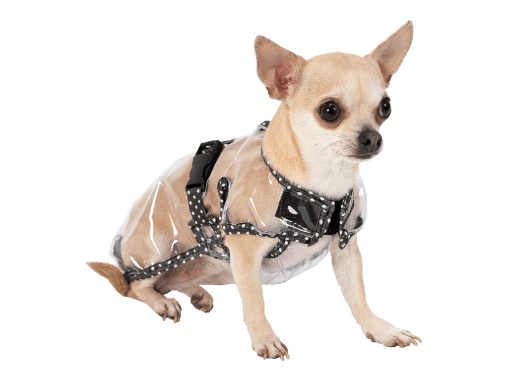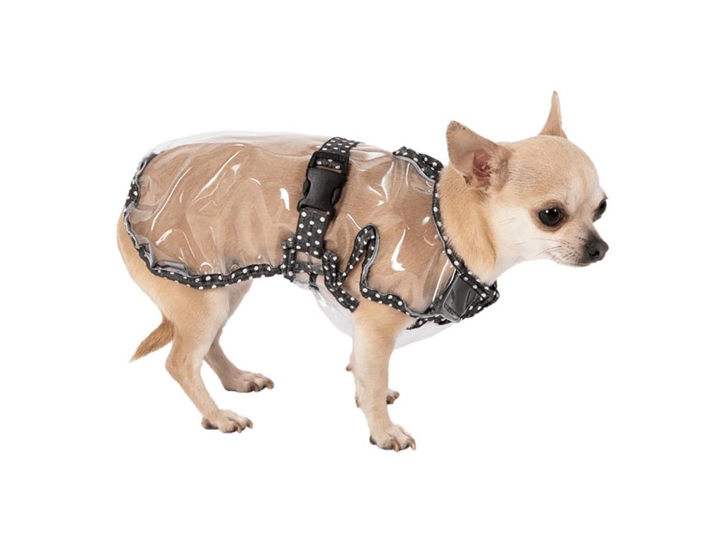 - Velkou předností psí pláštěnky je materiál, který je nepromokavý a nezpůsobuje při pohybu psa natolik nepříjemné šustění.