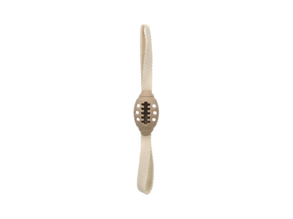 Hračka pro psy ve tvaru ragbyového míče je vyrobená z termoplastické gumy (TPR) s bambusovým vláknem. Při kousání masíruje dásně a pomáhá omezovat tvorbu zubního plaku, čímž přispívá k přirozené péči o chrup. Úchyty na obou koncích hračky slouží k interaktivní hře a přetahování. Prohlubně v míčku lze naplnit pamlsky nebo jedlou pastou a zvýšit tak motivaci ke hře.