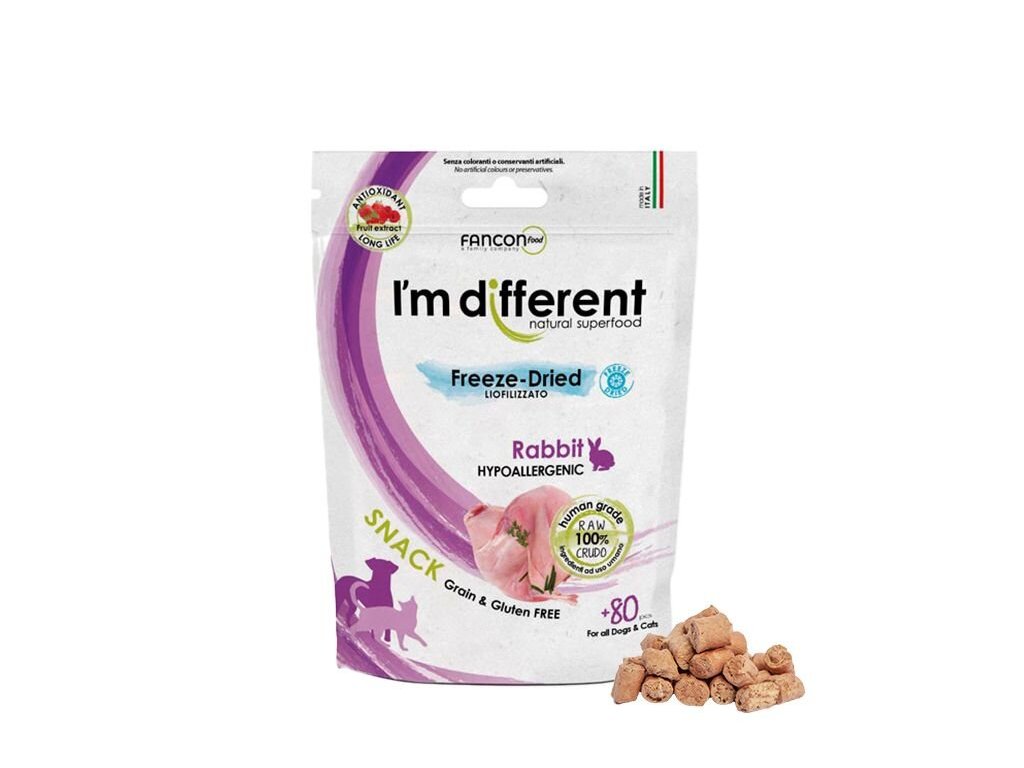 Složení: čerstvé králičí maso 65 %, čerstvá králičí játra 30 %, inulin, zeleninové aroma, extrakt z rozmarýnu, směs tokoferolů (přírodní konzervant), kvasnice, směs extraktu ze sušeného ovoce (extrakt z hroznových semínek, divoká borůvka, antioxidant kvercetin, resveratrol pro posílení imunity, divoká borůvka, brusinka, višeň, sušená švestka, semena malin, jahoda) 0,025 %