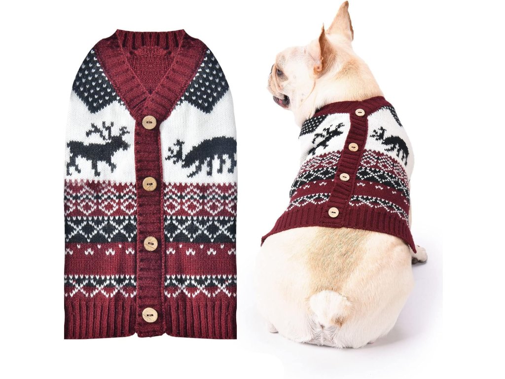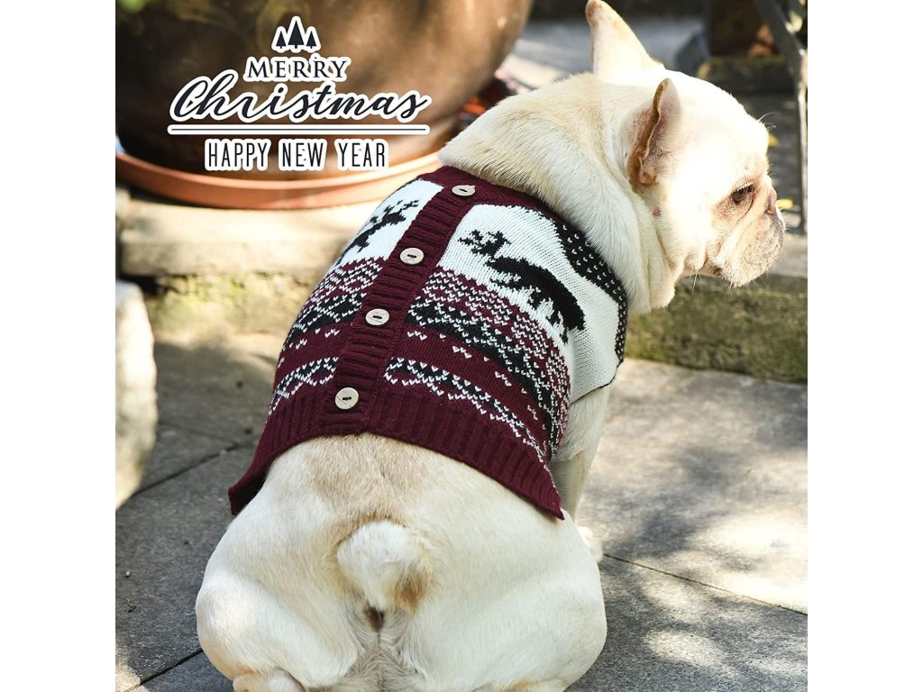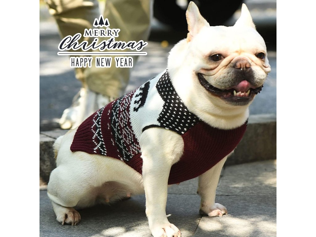 Pulovrový vzor je slavnostní a pro vašeho psa je krásným zimním oblečením.