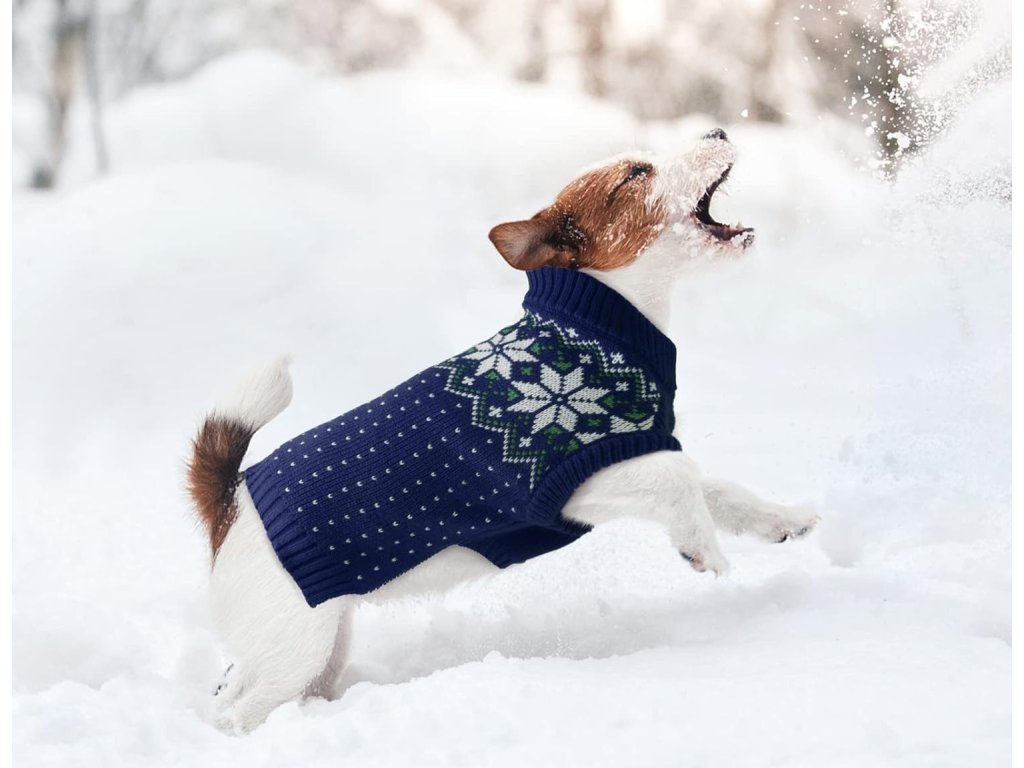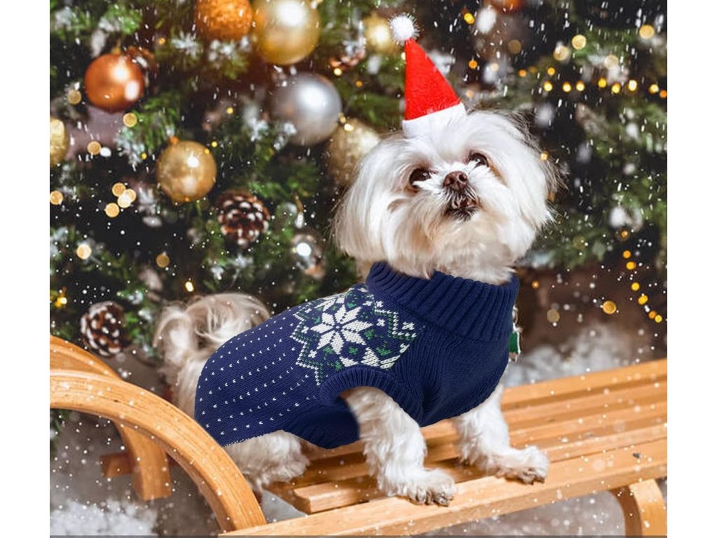 Pulovrový vzor je slavnostní a pro vašeho psa je krásným zimním oblečením.